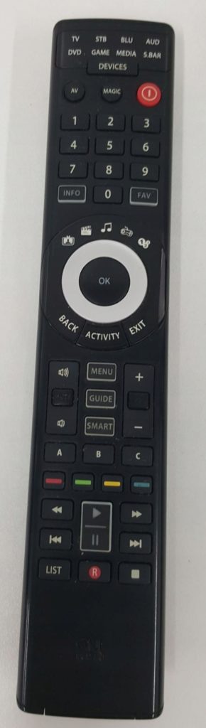 The remote control is streamlined for a comfortable fit in your hand. The buttons are large and respond quickly to a given command. The device has 30 buttons. Works at a distance of up to 10 meters.