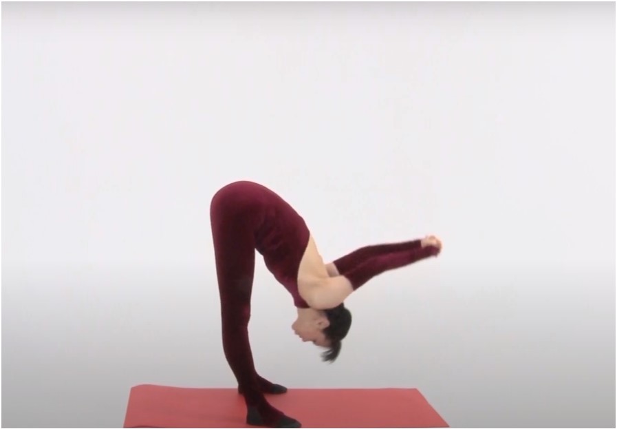 Bending over with hands behind the back