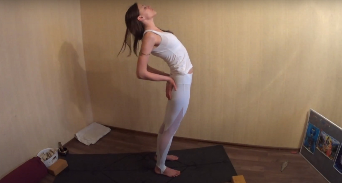 - Take an upright position. Place your hands on your hips and tilt back as much as possible while arching in your back. Keep track of your balance.