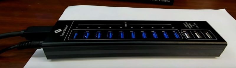 SmartDelux SDU3-P10C3 provides the user with 10 ports, the maximum data transfer rate of which is up to 5Gbps. The hub also has 3 ports for charging gadgets, providing up to 2.4 A of current.