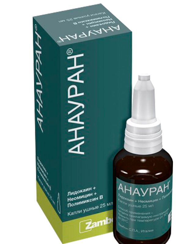 Manufacturer - Zambon S.P.A. (Italy). Glass dropper bottle, dark color. Contains 2 antibiotics (polymyxin B, neomycin), local anesthetic (lidocaine). Prescribed for treatment: