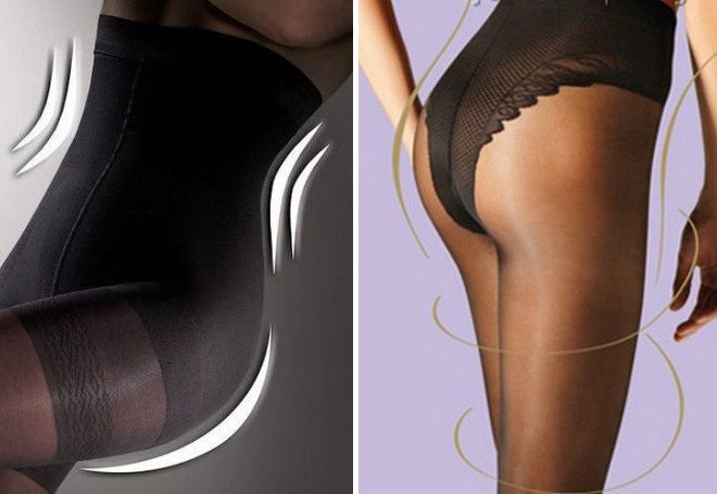 The second option has a complex structure, at the top of the tights are dense and elastic, such a product gives shape and shapes the figure.