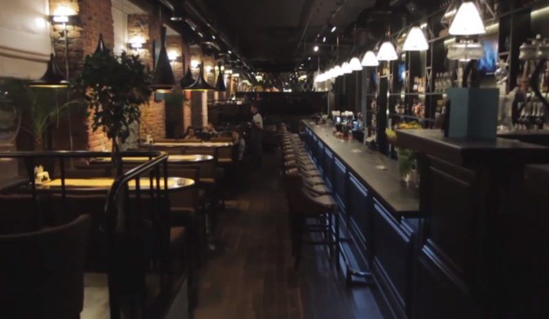 The first, dark room, is a room with a capacity of 180 people. Bar counter, 15 meters long, walls, cabinets, tables and shelves are painted black. The chairs are upholstered in brown leather. Columns of brown brick are installed next to the large windows. There are plants on the windowsill near each table. The interior is complemented by designer lamps installed above the bar and tables.
