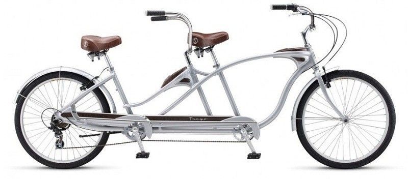 The tandem is an interesting model for leisurely cycling trips for two (sometimes three). In addition, each cyclist has the ability to pedal thanks to a separate drive system. There are two (three) seats, long frame, no shock absorbers. Tandems can be walking, mountain or road.