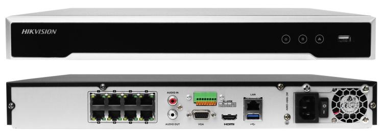 Networked eight-channel model of the Chinese assembly for quickly creating a video surveillance system, compatible with the equipment of its brand and the ability to connect video cameras from other manufacturers. Quick finding of image fragments is carried out using smart search. The backup is performed on external media connected via USB ports. Power supply to cameras (PoE) is carried out at a distance of up to 300 meters using a high-quality UTP cable.