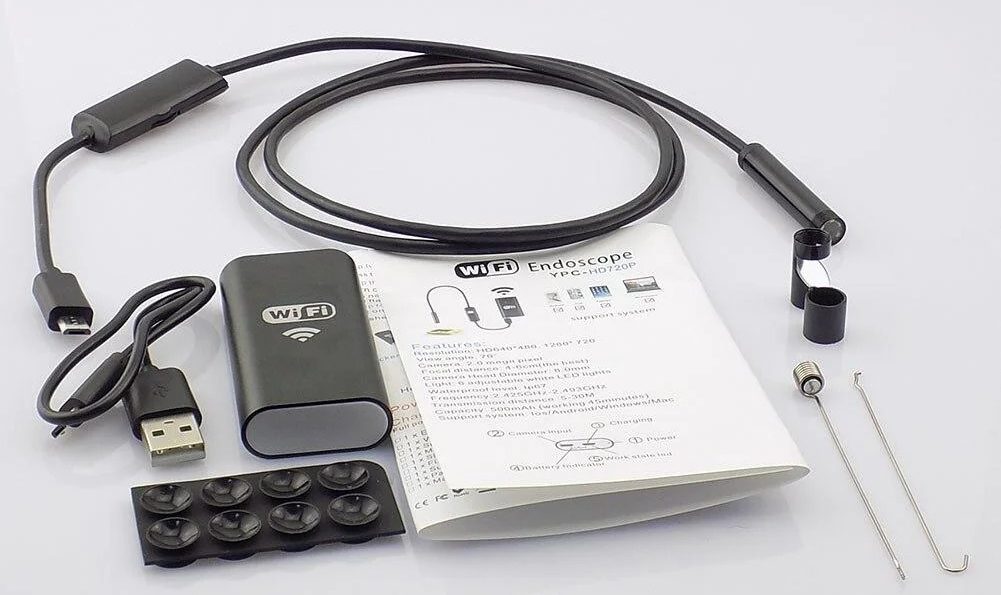 Mid-end endoscope with Wi-Fi coverage up to 20 meters. The probe is equipped with a special hook for catching small objects, a magnet for attracting iron parts and a mirror for viewing. The device is protected from water and dust ingress with an IP67 protection index. The maximum video resolution is 640x480 pixels. There is no built-in display, the image is broadcast to the connected mobile device. The device is sold at an average price of 5500 rubles.