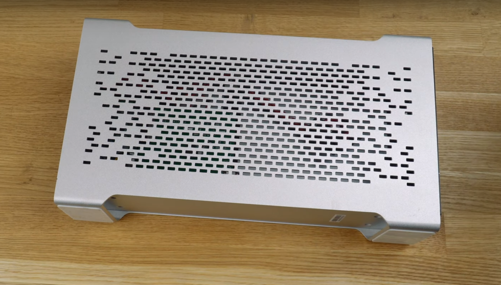 PowerColor is a well-known Taiwanese corporation that needs no introduction. And the first thing that attracts buyers' attention is, of course, the design. The station is made in a unique style, resembling a rectangular parallelepiped with cut edges. Most of it is a mesh for ventilation, and four large screws around the perimeter give it extra impressiveness. The final touch is a stylish logo made on the side face - demonic wings and the inscription "Devil". So the Devil Box looks really cool and fully lives up to its name.