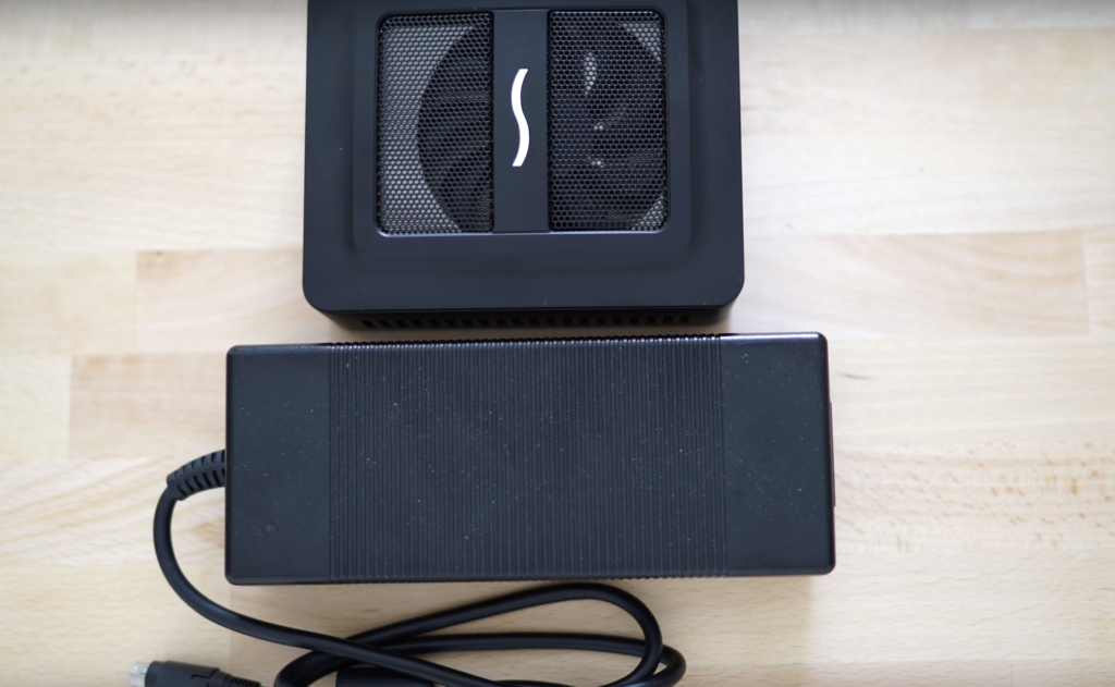 The cooling system includes a temperature controlled fan that does an excellent job of keeping the unit cool during load. It is worth saying that the power supply is portable, that is, the device itself must be connected to both the laptop and the power supply unit. Users do not like this solution too much (the power supply takes up space, you must always have a power cable with you), however, it avoids additional heating in the device case. The built-in interfaces are as follows: one HDMI and three DisplayPort.
