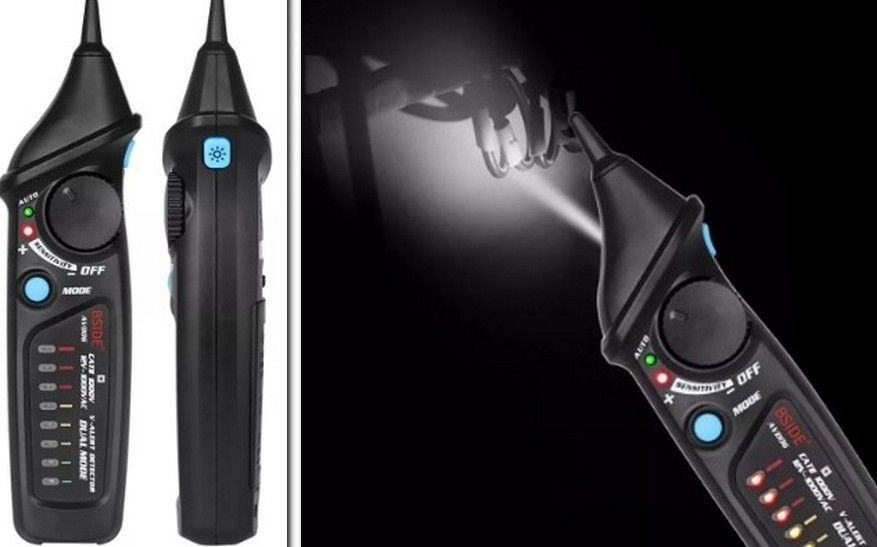 A device for measuring alternating current without direct contact with the mains. It is equipped with a flashlight, which allows you to take readings in the dark, it is especially convenient to use in everyday life, when, for example, traffic jams have been cut down. The device is programmed for autonomous shutdown, which is activated after 5 minutes of inactivity. It can distinguish between zero and live wiring, as it has several sensitivity modes. there are 8 LED bulbs on the body of the device, which glow in three colors: yellow, green and red. The voltmeter can be adjusted manually or automatically.