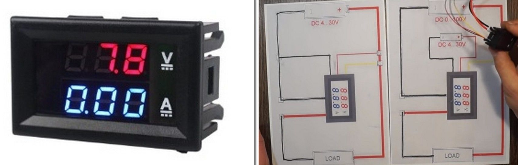 The electrical measuring device is two-color: blue for current readings, red for voltage. Black plastic body. Device connection diagram in two versions: