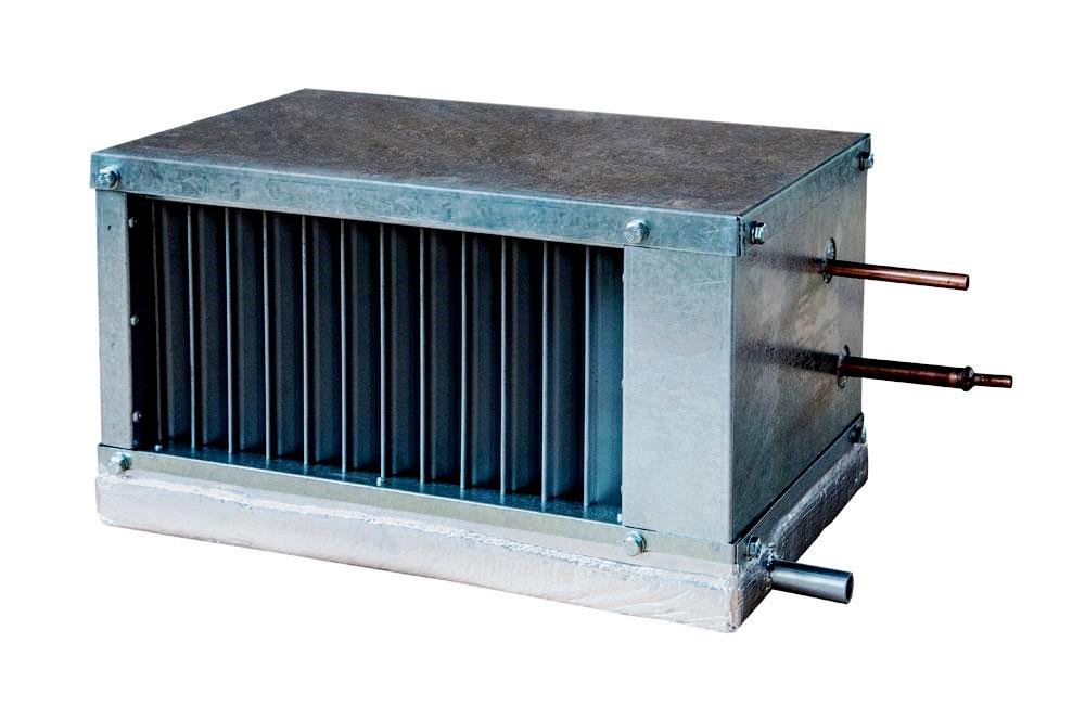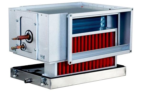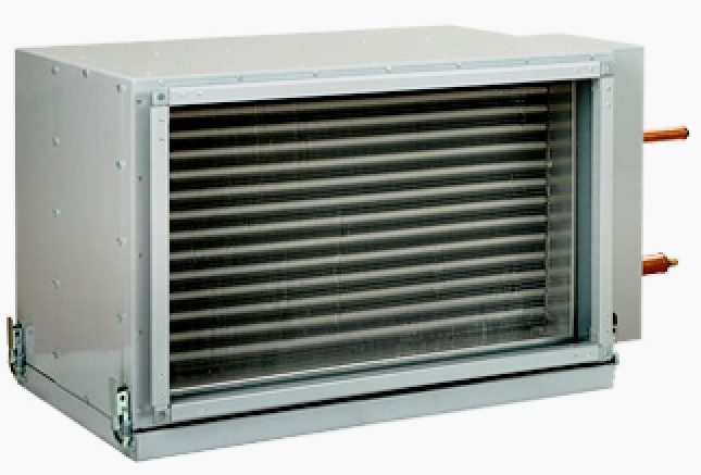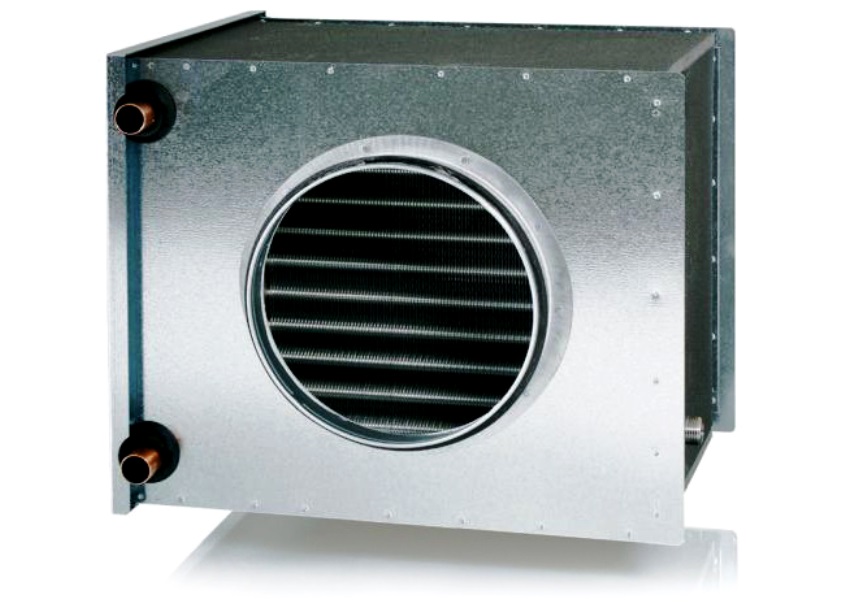 It is used to cool air masses in systems with a rectangular section. For the manufacture of the case, sheet steel is used, which is covered with a protective zinc layer. Inside there is a heat exchanger, which consists of a plurality of copper tubes with aluminum fins, as well as a droplet separator and a drain pan. The ribbing has a pitch of 2.5 mm. There are auxiliary flanges on both sides of the body. With their help, additional elements of duct ventilation are connected. The condensate flows out through a galvanized pipe, which is presented in the form of a pipe. Its thread is ½. Allowable pressure inside the system is 3.0 MPa. During the manufacturing process, the structure is tested under 3.3 MPa conditions.