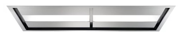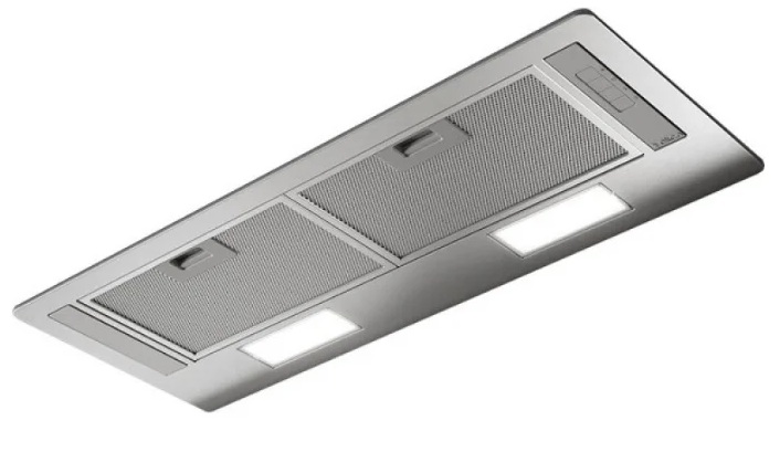 Panel for recessed installation in a rectangular cabinet with ventilation outlet and two zones, each with LED lighting. The body is made of stainless steel, has a mechanical control system (push-button). The grease filter is made of aluminum (2 pcs.). The controls are comfortable and primitive. To clean or replace the filter, you need to open the grates; for this, there are built-in handles on each zone.