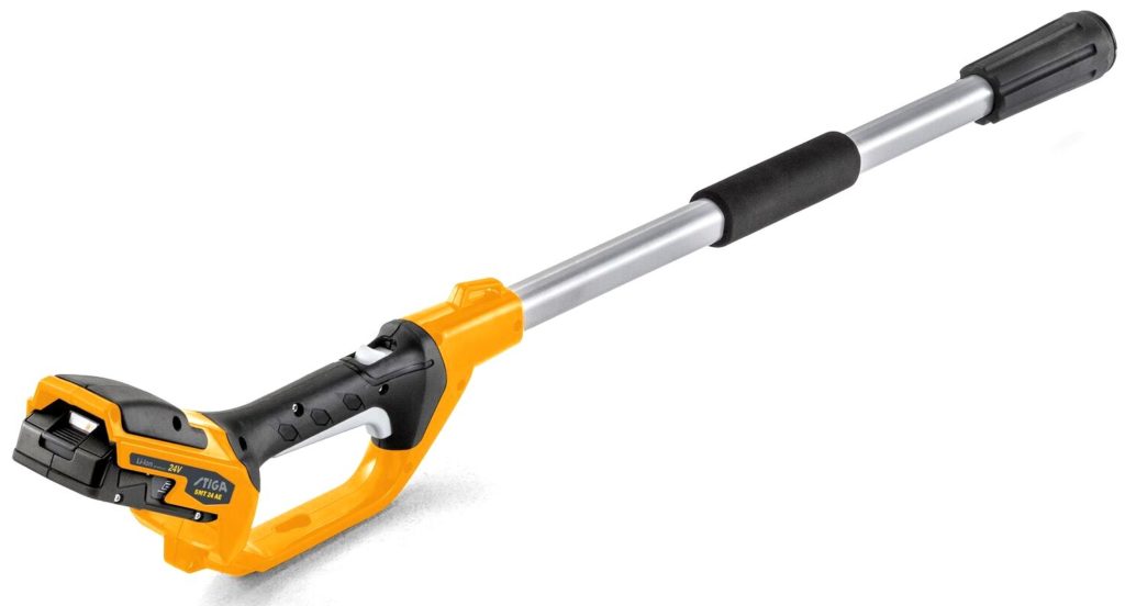 An excellent example from the eminent Swedish concern. The 45V battery guarantees the high power and performance of the selected model. The manufacturer is confident that the device can work with any type of planting. The handle is made of aluminum and can reach 2.95 m. The tire size is 250 mm, which is considered the standard size. However, for battery-type garden equipment, this indicator indicates the possibility of a sufficient cutting height. The people have a second nozzle (brush cutter), which will allow you to take care of not only tall trees, but also bushes.