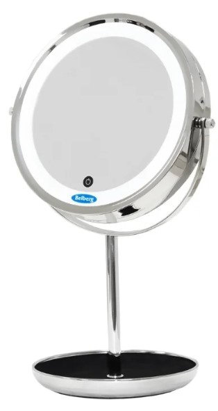 Manufacturer - Belberg (Germany). The shape is round. Mirror diameter - 17 cm, width - 21 cm. Silver-colored metal frame. Double-sided: one side is normal, the other is 7x magnification. Swivel - 360 ⁰. Set - 4 batteries. The warranty is 12 months.