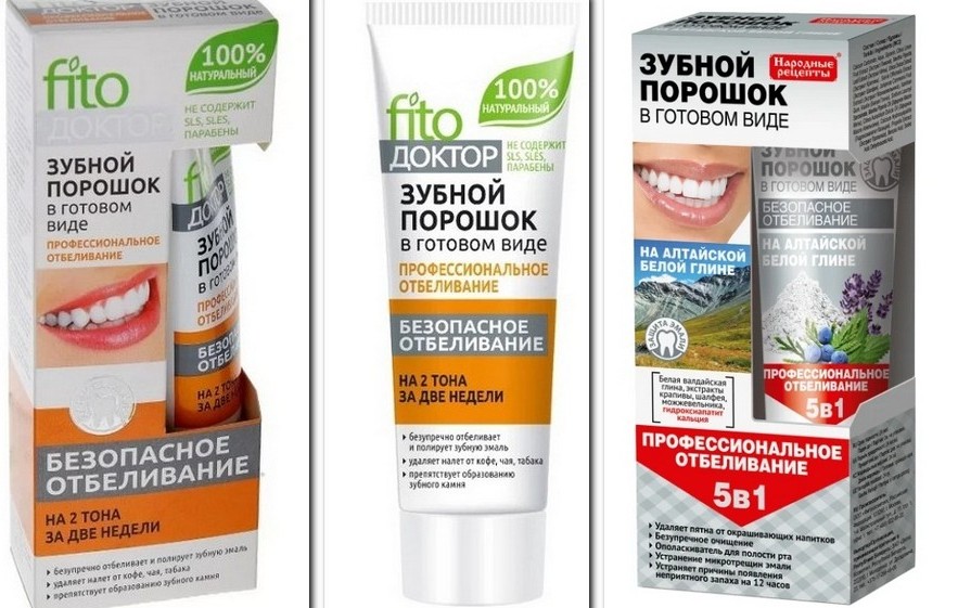 "Fito Doctor" from the manufacturer "Fitocosmetic" - the first two models, the third picture shows tooth powder from the "Folk recipes" series