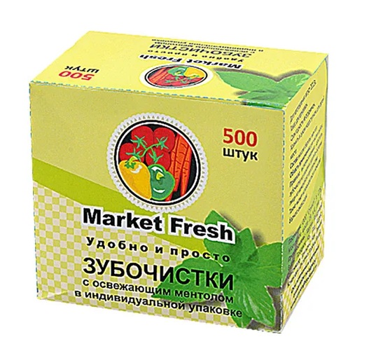 Toothpicks pointed at both ends, one of which has a refreshing spray for the oral cavity (menthol). Each stick is individually wrapped in paper and placed in a cardboard box.