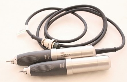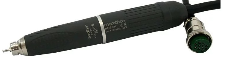 A tip in a thin plastic body and metal inserts: head, rear part of the structure, connecting plug (upper part). Half of the micromotor is straight, the other half (closer to the tip) is tapered and ergonomic. Compatible with the same control units as the “SDE-BM50M / BHS1” model.