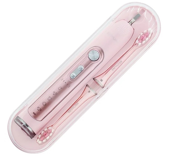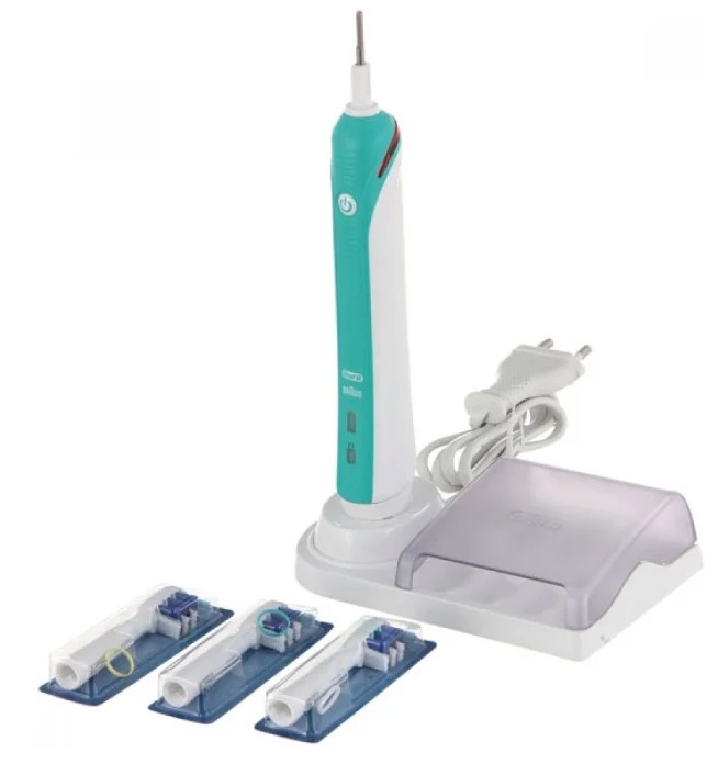 A set of three nozzles with a portable charger. It has a storage and carrying case, a stand with a holder for additional attachments. Indication of battery charge and brush bristle wear notifies of timely recharging / replacement, respectively. There is a tooth pressure sensor, as well as a timer setting function. Sound vibrations are counted depending on the installed head.