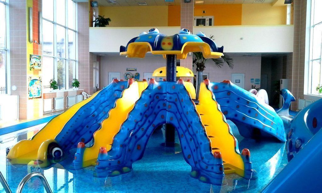 The children's entertainment center includes a water park, a spacious swimming pool, and an ice rink. The children's pool is 12 * 9 * 0.9 meters in size. On average, the temperature of the water in each pool and the air in the room is kept within 28-32 degrees. In general, the center can accommodate 400 people. On the territory there is a cafe, a swimming pool with a built-in geyser and hydromassage installations. A two-level labyrinth and a slide with a sandbox have been built for kids. For a great time, you can rent wicker chairs. Locker room, wardrobe and bathroom equipped with everything you need for convenience. If you want, you can play billiards, volleyball or badminton.