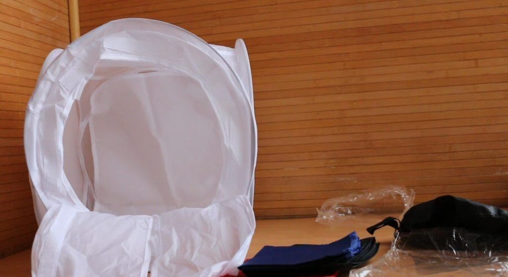 The lower part of the cube is removable and can be placed on a table, stand or any suitable surface. The back wall is also removable, you can detach, change backgrounds and complete at your discretion. It is disassembled very quickly, which is especially important for those photographers who still cannot boast of speed in assembling equipment for a while.