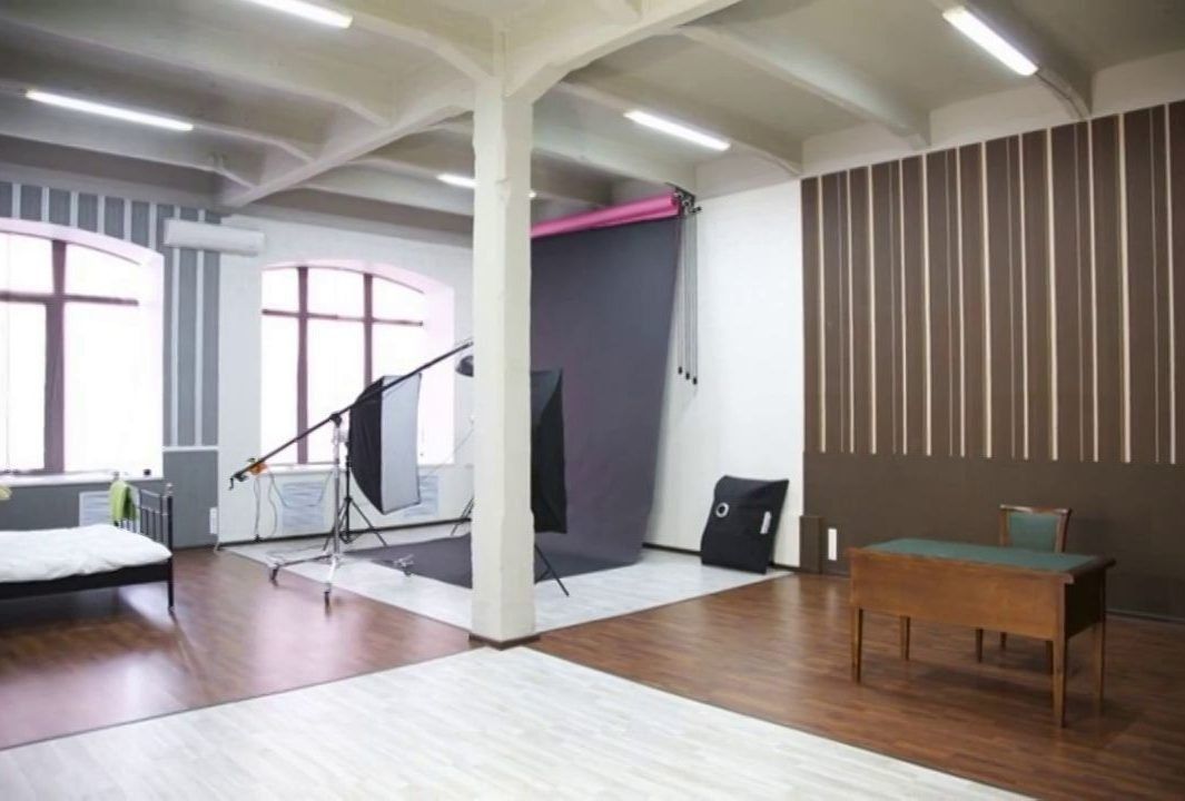 The photo studio is located on 200 m². Clients are provided with two shooting rooms with a ceiling height of 3 m. The interiors are decorated in a loft style and a beam decorated in gentle tones, the decorations are constantly updated and reconstructed. Mobile furniture, including a bed, sofa, armchair, fireplace, can be easily moved anywhere.