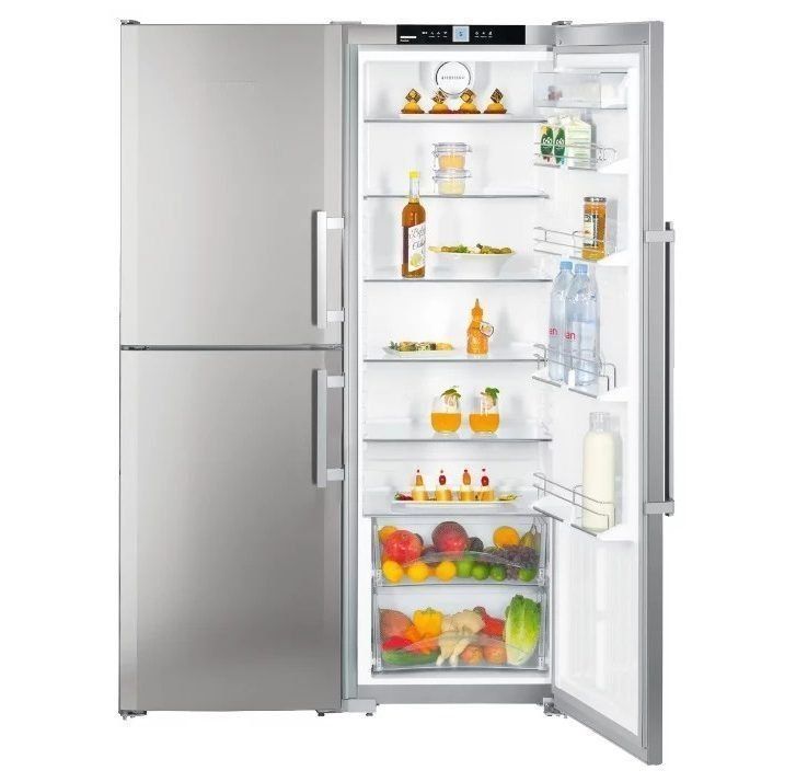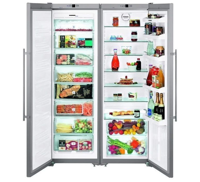 A two-compartment refrigerator with two doors from a well-known German company consumes about 303 kWh per year. There is only one compressor in the device, the refrigerant used is isobutane. The freezer chamber is located at the bottom. The device has electronic control.The device does not need defrosting, and in the absence of electricity it can keep the cold inside for up to 20 hours. Up to 15 kg of food can be frozen in it per day.