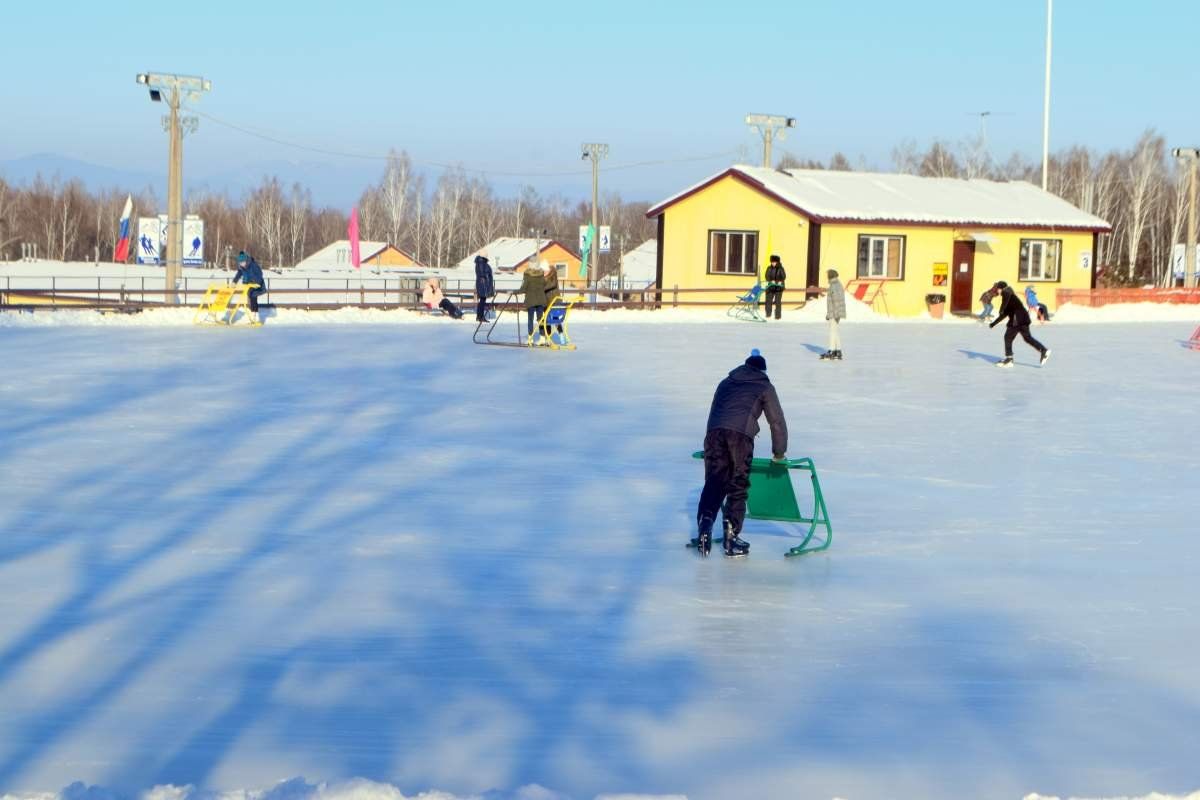 In addition to perfect ice, the ice rink also benefits from good lighting at night. At the same time, there is no other infrastructure provided here: there are no changing rooms and wardrobe, no toilet and snack bars, and there is also no musical accompaniment.
