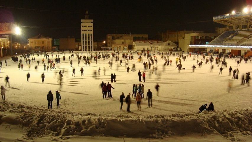 This skating rink is popular with many residents of the city. The only thing that saddens is its location in relation to the city center. The skating rink is located on the territory adjacent to the shopping center "Rainbow". The ice is constantly under control and renewed.