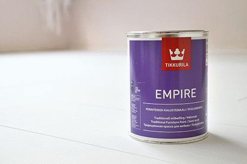 Tikkurila Empire base is a paint that is suitable for painting wood and metal surfaces, as well as for finishing furniture. Alkyd based. Packaged in cans of 0.255 l, 0.9 l, 2.7 l and 9 l. The paint has many advantages and is ideal for interior use. Has a semi-matte effect, there is a slight sheen. The price for a can of 0.9 liters is 700-800 rubles.