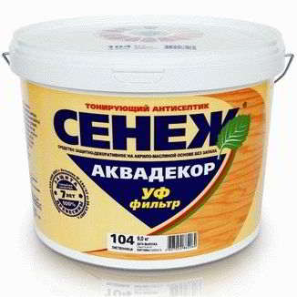 SENEZH AQUADECOR is an antiseptic with the main task of protecting the wooden surface. There is a fairly large palette of colors.