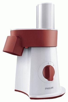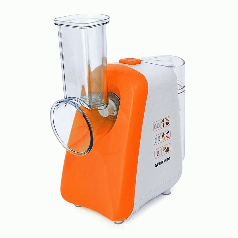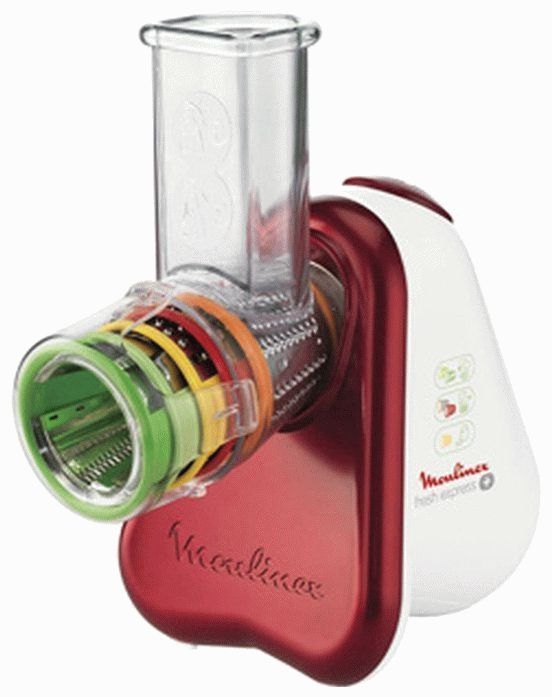 Compact shredder-grater with five different attachments. The principle of operation is simple: the required nozzle is inserted, the products are fed into a pipe with a hole on top, and a crushed product is obtained at the exit.