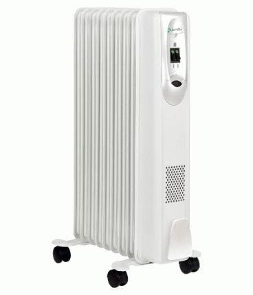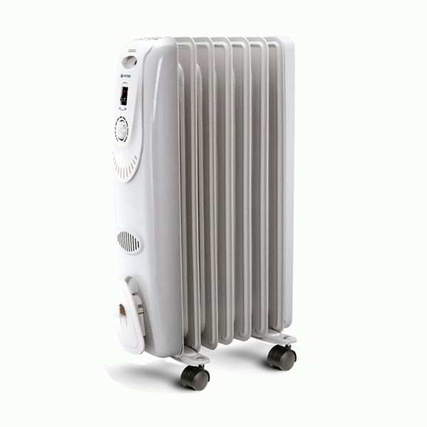 A good and high quality oil heater with 7 sections. Powered by a regular 220 W power supply. There are several operating modes - 600, 900 or 1500 watts. That is, you can quickly and without much difficulty heat one room, a small living room, or a fully equipped two-room apartment. The non-standard appearance of the heater will allow for the first time to use this type of technique as a decoration tool. There is a small reel for storing a long cord.