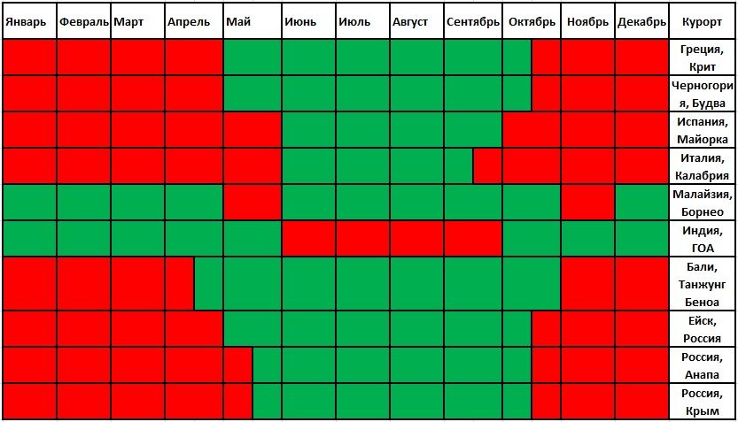 Vacations, as a rule, are planned in advance in order to get exactly to the country that they dreamed of, sitting in an office chair for many months on end. One of the most important conditions for choosing is a comfortable season for recreation at the resort. If everything is already clear with the dates of the vacation, but the place is still not very good, a summary table will help to narrow the range of choice, in which the months favorable for recreation are marked in green, and those in which it is not recommended to visit the country due to uncomfortable climatic conditions in red.