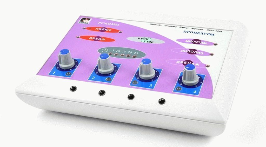 This is a professional device that can be used at home nonetheless. Its difference is that there are a lot of functions and it is designed to solve several problems.This device can be used not only for myostimulation, but also for electrolysis and lymphatic drainage. With it, you can work out all muscle groups, including not only the muscles of the body, but also the face. It is useful for strengthening muscle tissue, for body shaping, and for eliminating signs of cellulite and the effects of trauma.