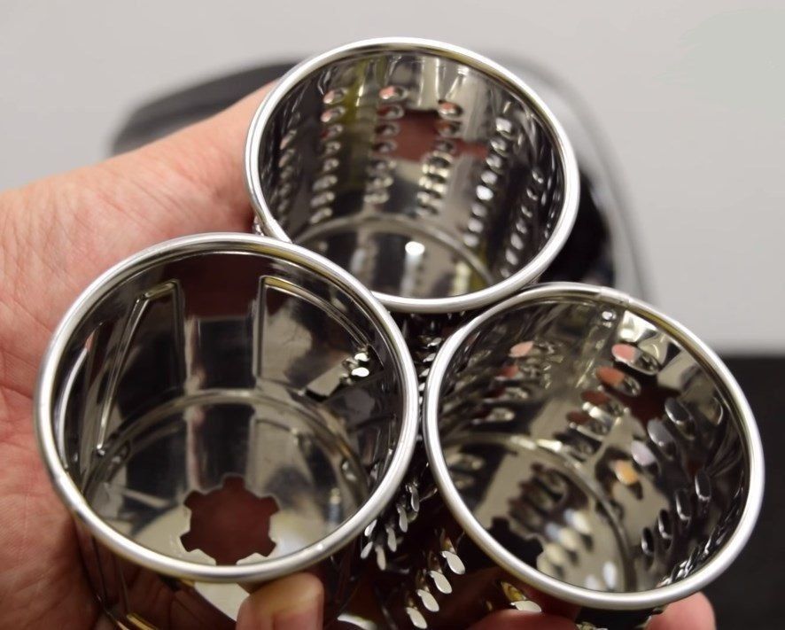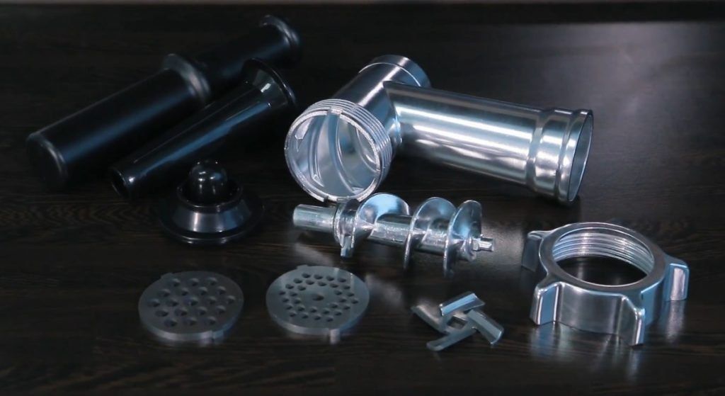 The device spins 1.9 kg of minced meat per minute at a power of 180 watts. Wiry meat is often problematic. There are only two nets for minced meat: 5 mm and 7 mm. Nozzles for vegetables (coarse and fine grater, shredder) are made of thin metal, so they may deform a little during operation and wash the plastic.