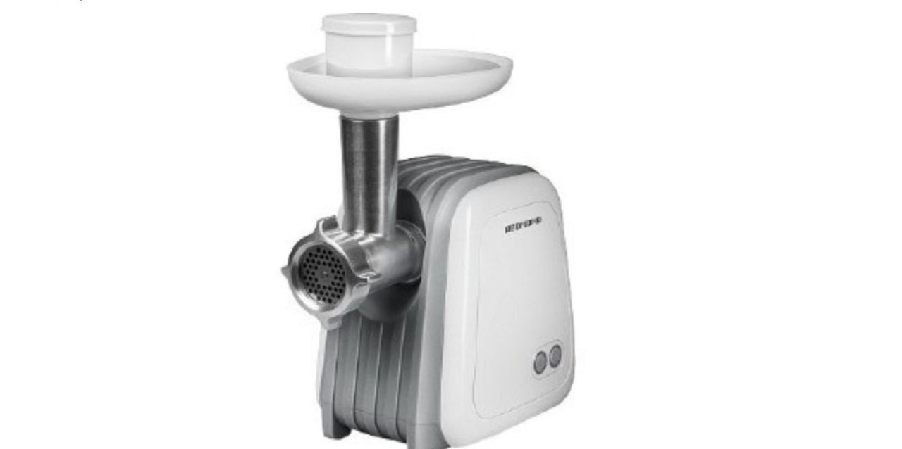 Meat grinder Redmond rmg 1232 is easy to use and has a nice white body with a gray insert.