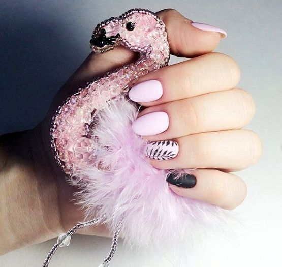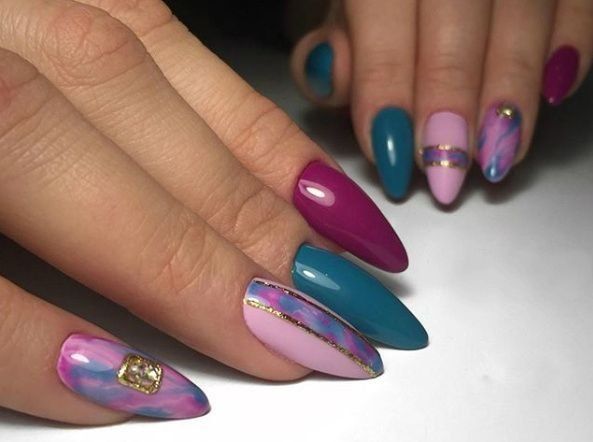 Founder Kosinova Anastasia not only teaches manicure to beginners, but also actively works with clients. In the performance, the laid-out ART service jackets on long extended nails look great. The painting is done mainly on the tips.