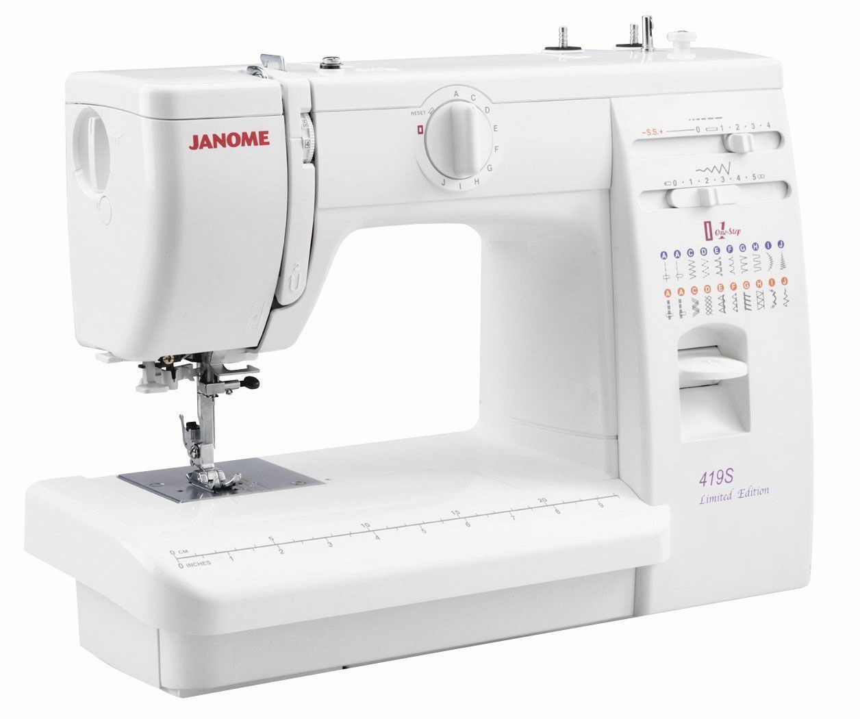 The body is equipped with a foot for sewing in a zipper, a needle threader and a compartment for small items (buttons, locks, etc.). Maximum stitch parameters: 4 mm - length, 5 mm - stitch width.
