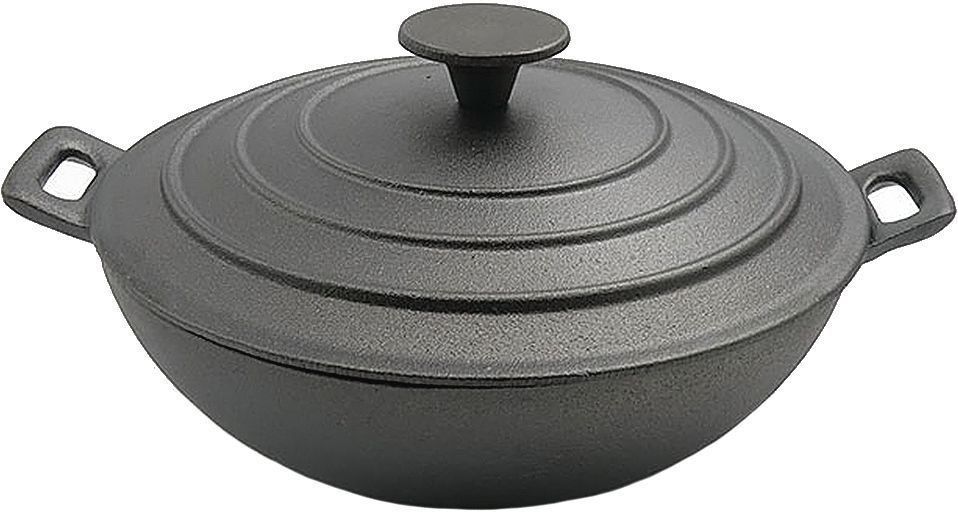 The handles are located on both sides and are molded together with the pan base. Comes with a convex lid. It is also made of cast iron.