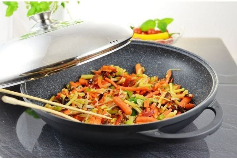 The design will impress anyone. The wok itself is made of aluminum with particles of marble, which allows it to be free from scratches and bumps. And the included lid is made of stainless steel (polished to a shine) and a glass window is located at the top (allows you to watch the cooking process).