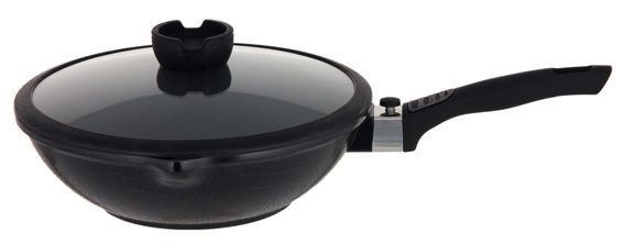 One of the common wok models. Its diameter is 28 centimeters. The design is strict, black color prevails. The cover looks like crocodile skin.Has one long handle that can be removed. This makes it easier to store. Made of aluminum, which makes it lighter. Heating is fast and even. There is a non-stick coating. The lid is glass, fits perfectly to the pan thanks to the silicone seal.
