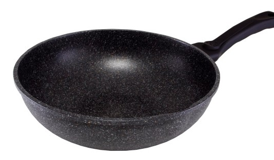 The 20 cm diameter wok frying pan is made of aluminum. Has a marble finish. This makes it scratch and shock resistant. The designers have thought through everything to the smallest detail - the handle is black, the body is made in black marble, the spout makes it easy to remove excess liquid. Equipped with one ergonomic handle.