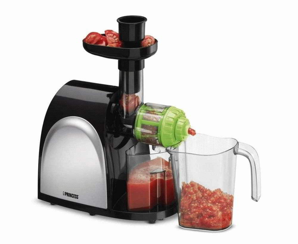 Centrifugal. In such a machine, raw materials are loaded into the upper compartment. Then, with special knives in the form of disks, the raw material is crushed, the juice is separated and enters a special container, and the remaining cake falls into the corresponding compartment. This principle of operation causes the device to heat up, which affects the quality of the juice, it is slightly oxidized. Another disadvantage of the centrifugal device is the inability to get juice from herbal raw materials to get a green detox cocktail. But at the same time, such a juicer is suitable for everyday use.It can be loaded with solid raw materials in any quantity. It is suitable for large quantities of apples or for making tomato juice.