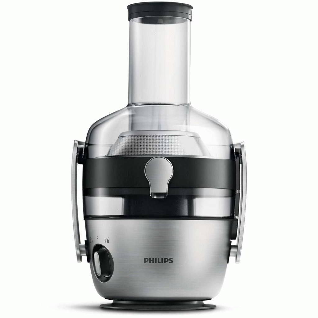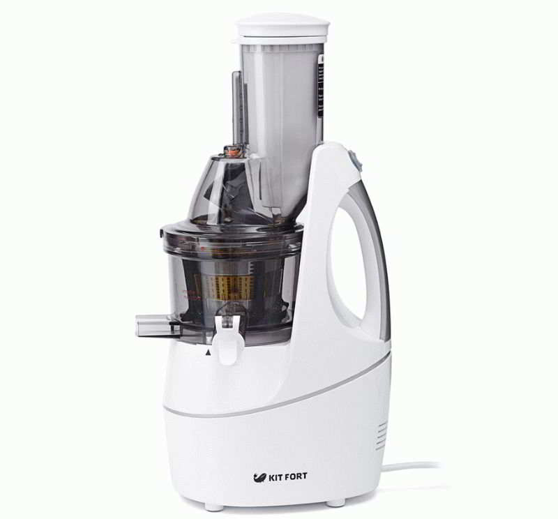 An inexpensive centrifugal juicer suitable for a family.It copes well with raw materials of any hardness. The wide neck allows you to place whole vegetables and fruits. Quickly squeezes out the juice, but the cake is not dry enough.