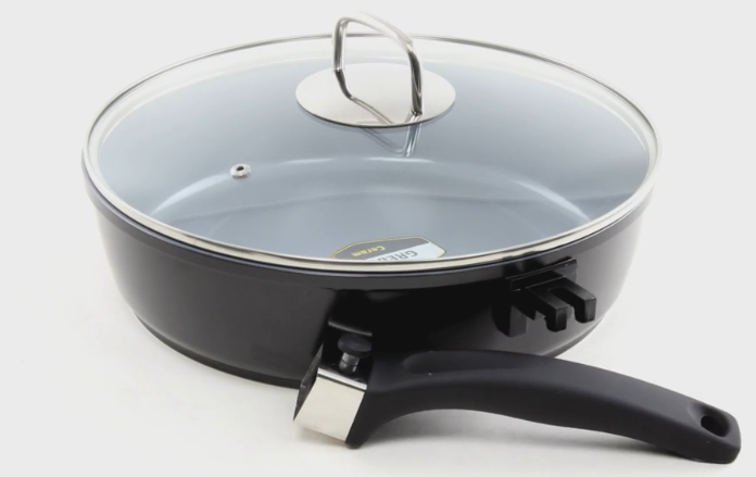 The universal frying pan turns into a saucepan thanks to the removable handle. The handle and the outside are in black. The handle can be easily removed (at the push of a button on the handle). It looks massive.