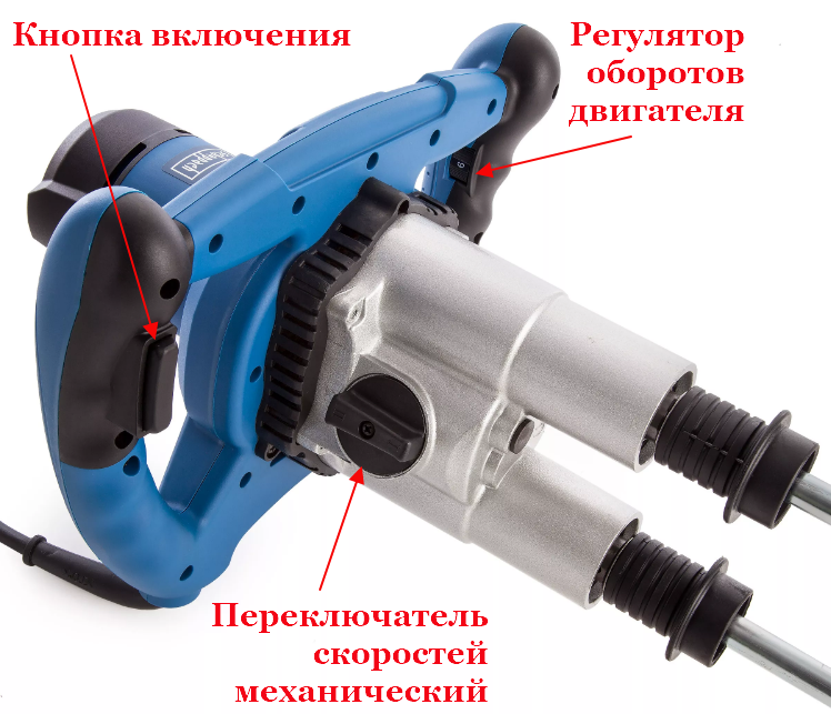Since the principles of operation of the mixer are similar to an ordinary drill, when choosing the power, they are guided by the amount of work. The number of revolutions per minute is selected based on the viscosity of the prepared solution. In the case of working with various types of solutions, a mixer with a two-speed gearbox is used.