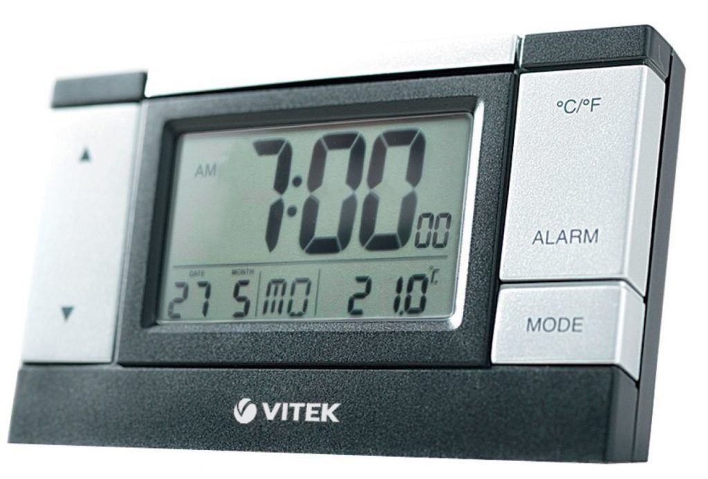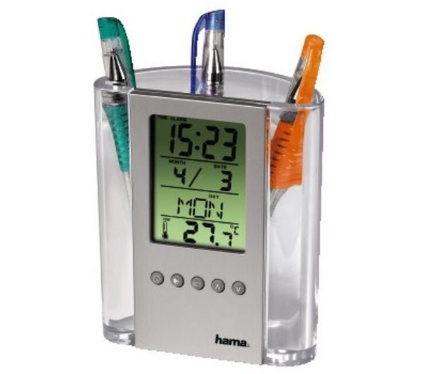 Universal stand-weather station with monochrome display. Has the following functions: alarm clock, clock, playing melodies. Measures room temperature up to +50 degrees. Has a secondary function in the form of a holder for pencils and pens. Battery operated. Average price: from 600 rubles.