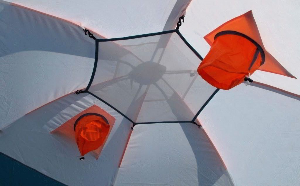 There are two special valves for ventilation. The inner layer of the cover is made of fine mesh. This model can be used for travel and hiking of average difficulty. There can be two people inside.