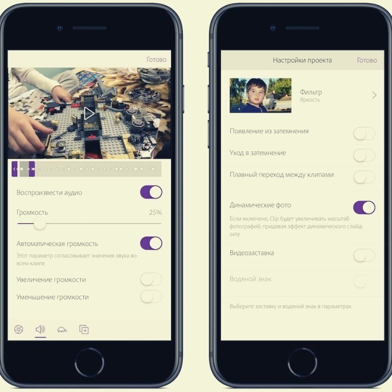 You can use it both in portrait and landscape mode. The shell of the editor is made in such a way that it will be comfortable and ergonomic on both iPhone and iPad displays. After the user sets up all pieces of content in the required order, attaches a soundtrack and signatures, uses filters, etc., the finished multimedia project can be saved to the device's memory.