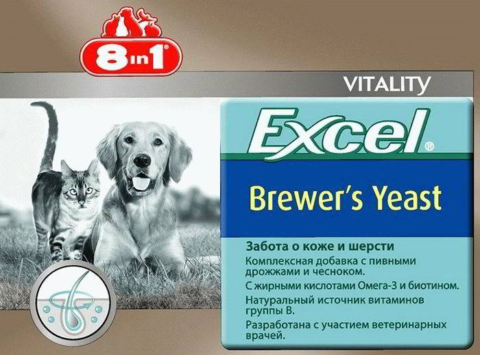 Brewer's yeast is a recognized source of vitamin B, which has a good effect on the body; it also contains linoleic acid, amino acids, zinc, iron, copper, and cobalt. The complex enhances immunity, improves skin condition, promotes rapid hair growth, and is the prevention of liver diseases in dogs.